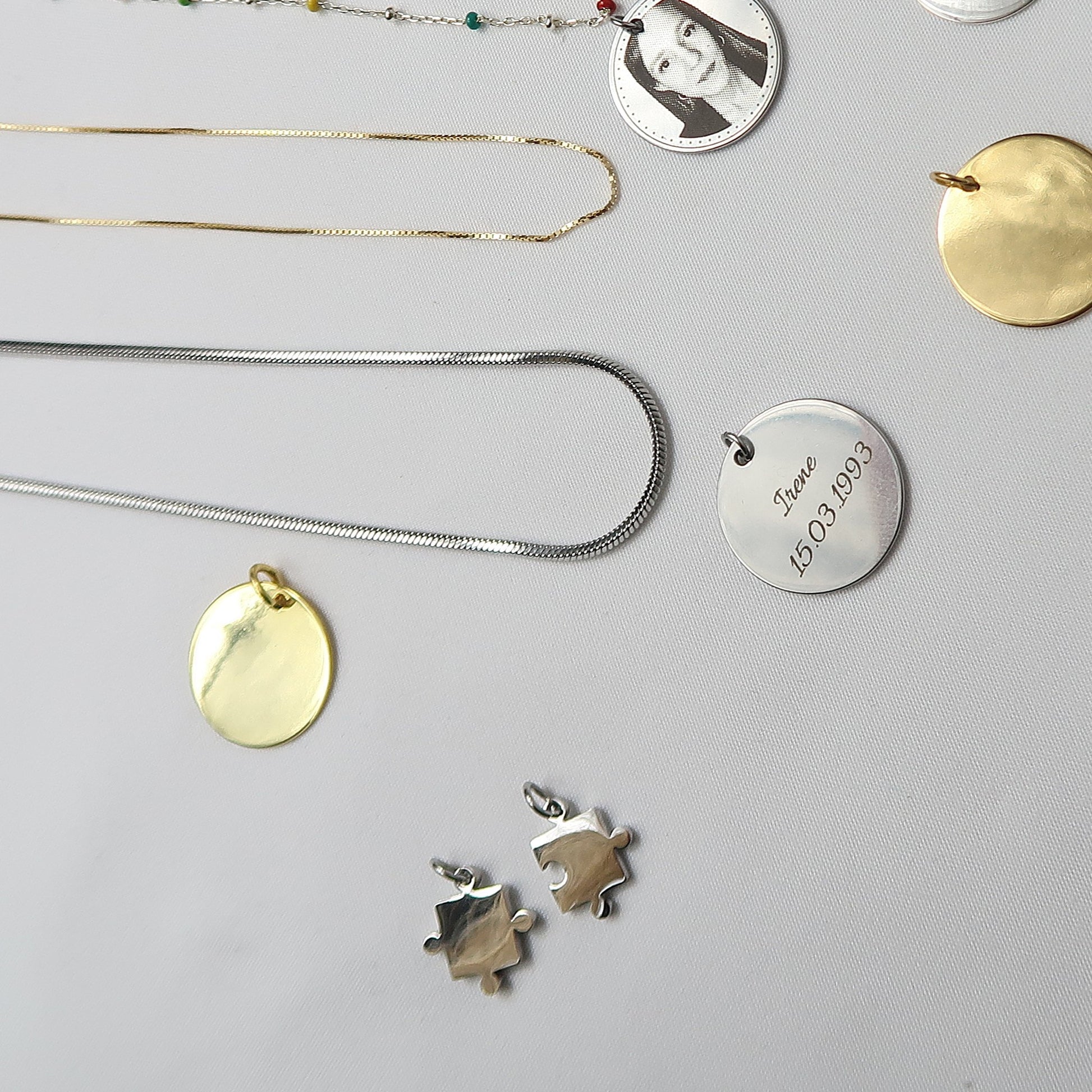 Estas placas son perfectas para personalizar con un grabado simple y compartirlas con otra persona. Su composición es de acero inoxidable plateado y tiene una medida de 8 mm de diámetro.